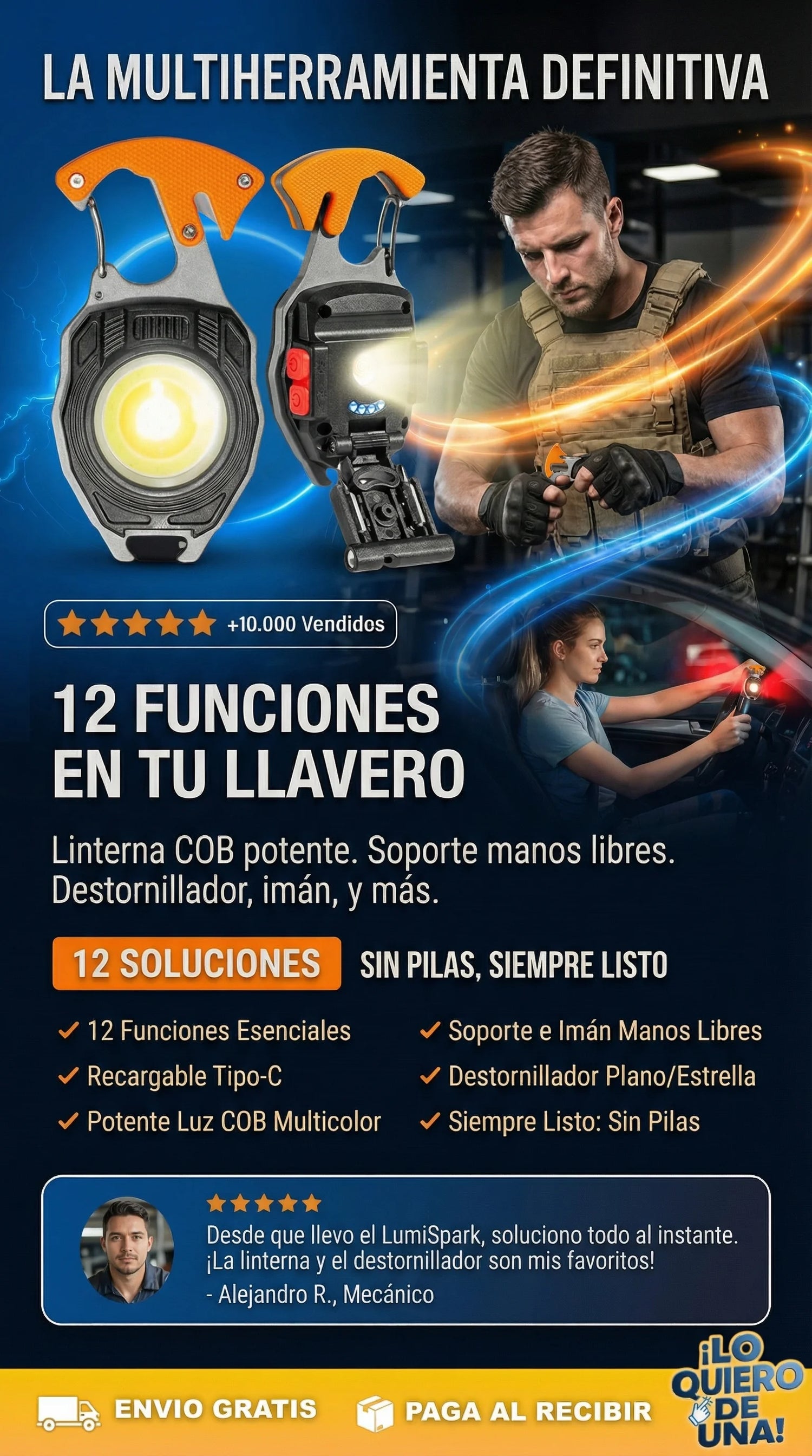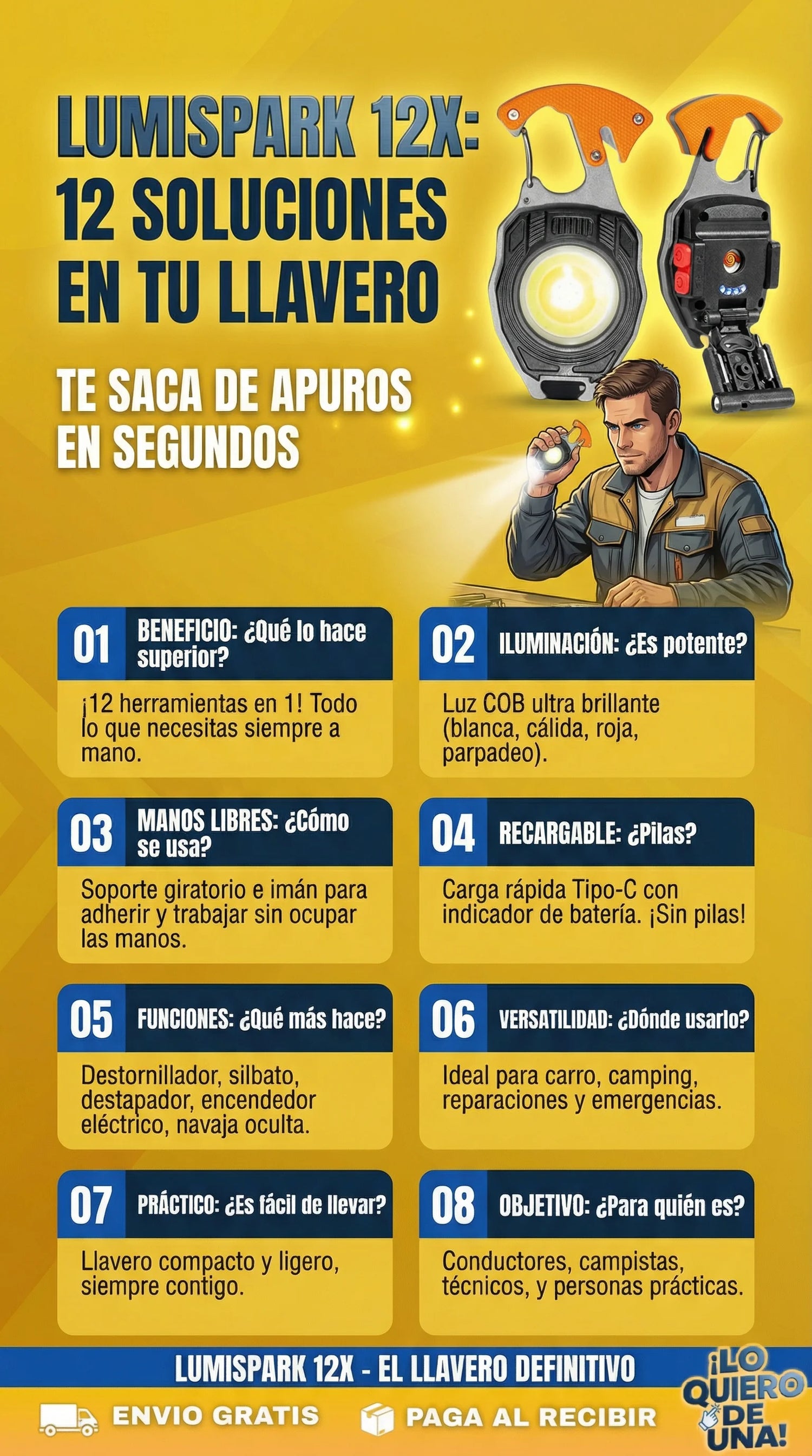 12 funciones en tu llavero: luz, herramientas y emergencia en un solo producto.
